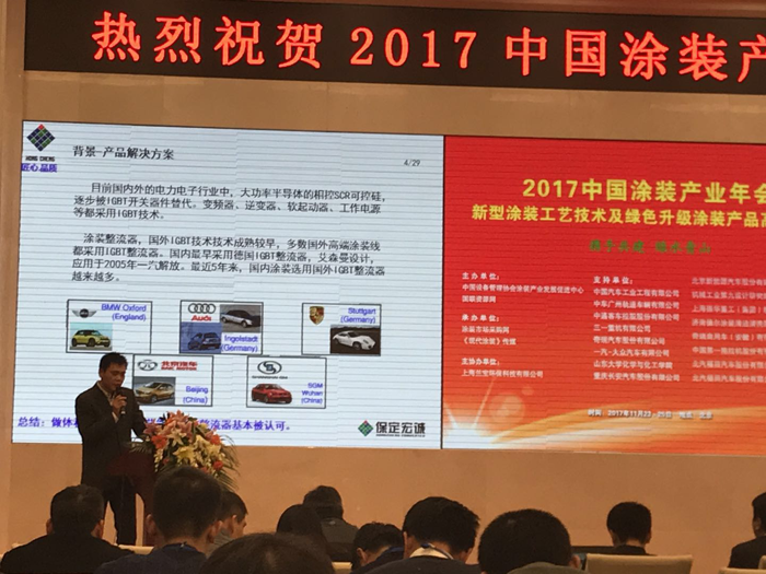 在年會(huì)上,我司總經(jīng)理袁世鋒先生以“涂裝電泳安全及節(jié)能的解決新方案——IGBT模塊電源”為題進(jìn)行了演講,重點(diǎn)介紹了IGBT模塊電源的發(fā)展,原理及應(yīng)用?,F(xiàn)場(chǎng)展示了保定宏誠(chéng)為汽車涂裝行業(yè)服務(wù)過的項(xiàng)目成果。