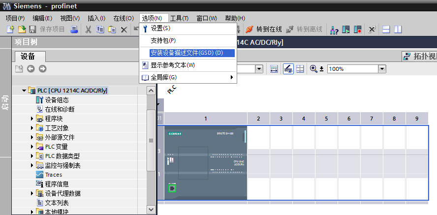 將GSDML文件拷貝入計算機硬盤。啟動“TIA Portal V13 ”軟件,打開任意工程,在軟件菜單欄點擊“選項”按鈕,在彈出的子菜單中點擊“安裝設(shè)備描述文件”。