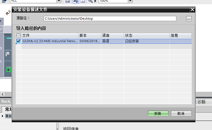在彈出的對話窗口的右上方點擊“…”按鍵,彈出文件路徑選擇窗口后,在此窗口選擇GSDML文件存放的路徑。選擇完畢后,軟件會自動搜索此目錄下的GSDML文件。當(dāng)軟件搜索到GSDML文件后,會顯示在列表欄中,勾選列表欄中GSDML文件的選擇欄后,點擊“安裝”按鈕完成GSDML文件安裝。